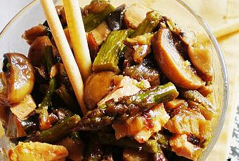 Poner los champiñones laminados, rehogar un par de minutos e incorporamos los espárragos troceados, rehogar de nuevo, salpimentar, poner el coñac y a los dos minutos el caldo, remover todo. Semitapar y dejar que reduzca unos 15 minutos.