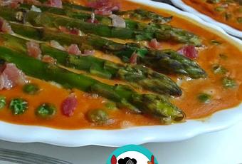 Para hoy tenemos unos espárragos trigueros con crema de tomate, acompañados por unos taquitos de jamón serrano.Un primer plato muy sencillo para tomar antes de una buena carne.