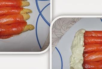 Envolvemos cada esparrago en una lamina de salmón.