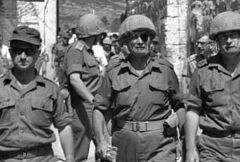 El general Moshé Dayán entra en la Ciudad Vieja de Jerusalén. Junio, 1967La Guerra de los Seis Días —también conocida como guerra de Junio de 1967 en la historiografía árabe— fue un conflicto bélico que enfrentó a Israel con una coalición árabe formada por la República Árabe Unida —denominación oficial de Egipto por entonces—, Jordania, Irak y Siria entre el 5 y el 10 de junio de 1967.Tras la exigencia egipcia a la ONU de que retirase de forma inmediata sus fuerzas de interposición en el Sinaí (UNEF), el despliegue de fuerzas egipcias en la frontera israelí y el bloqueo de los estrechos de Tirán, Israel, temiendo un ataque inminente, lanzó un ataque preventivo contra la fuerza aérea egipcia, al que Jordania respondió atacando las ciudades israelíes de Jerusalén y Netanya. Al finalizar la guerra, Israel había conquistado la península del Sinaí, la Franja de Gaza, Cisjordania, Jerusalén Este (incluyendo la Ciudad Vieja) y los Altos del Golán.Tras numerosos enfrentamientos fronterizos entre Israel y sus vecinos árabes, en particular Siria, el presidente egipcio Gamal Abdel Nasser expulsó a la Fuerza de Emergencia de las Naciones Unidas (UNEF) de la península del Sinaí en mayo de 1967. La fuerza de mantenimiento de la paz estaba situada en la región desde el final de la Crisis de Suez en 1957. Egipto acumuló 1000 tanques y unos 100 000 soldados en la frontera con Israel y cerró los Estrechos de Tirán a todos los buques de bandera israelí o que llevaban materiales estratégicos a Israel, recibiendo un fuerte apoyo de otras naciones árabes. Israel respondió con una movilización similar que incluyó el reclutamiento de 70 000 reservistas para sus Fuerzas de Defensa.La Guerra de los Seis Días se inscribe dentro del conjunto de guerras libradas entre Israel y sus vecinos árabes, tras la creación del Estado de Israel (1948) en parte de lo que constituía el Mandato británico de Palestina. Estos seis días de 1967 concitaron la atención mundial y resultaron claves en la geopolítica de la región: sus consecuencias han sido profundas, extensas y se han hecho notar hasta el presente, teniendo una influencia decisiva en numerosos acontecimientos posteriores, como la guerra de Desgaste, la guerra de Yom Kipur, la masacre de Múnich, la polémica sobre los asentamientos judíos y el estatus de Jerusalén, los acuerdos de Camp David y de Oslo o la Intifada.