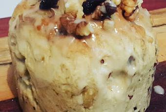 - Glasé: Integramos el jugo de limón, azúcar impalpable y de a poquito vamos poniendo el agua, hasta lograr la consistencia deseada. Bañamos los panes con esta preparación, yo le puse un par de nueces y de pasas.