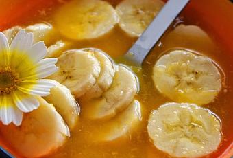 Preparación: Exprimimos el zumo de las naranjas. Pelamos el plátano y en un bol lo cortamos en rodajitas finas. Añadimos el azúcar y el zumo de naranja y removemos bien. Tomar inmediatamente.