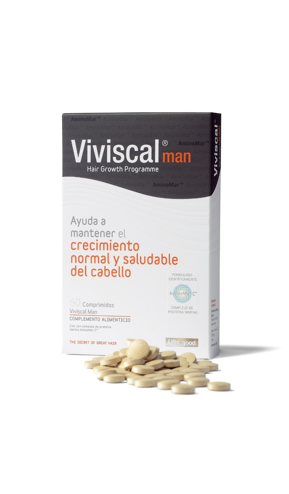 2. Viviscal® Man (49,95 €): Un sistema de nutrición que previene y trata la caída del cabello cuya fórmula contiene AminoMarC, un exclusivo y rico compuesto proteico a base de extractos marinos, sílice soluble orgánico, cola de caballo, extracto de acerola y vitamina C.
