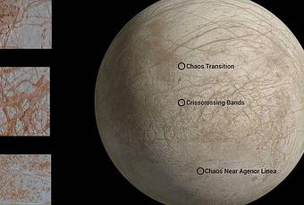 Tras estudiar datos acumulados de 20 años de la misión Galileo a Júpiter se han obtenido imágenes impresionantes reprocesadas de la superficie de Europa, una de las lunas galileanas del planeta gigante. Observándose una muy compleja e intrigante superficie, como podéis ver en la siguiente imagen: