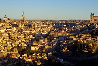 Subiendo las escarpadas y resbaladizas pendientes del lado allá del río, contemplé Toledo, extendida ante mí, como petrificado ejército de gigantes conducido por el Alcázar.Sin duda he contemplado mil exquisitos amaneceres, pero nunca vi espectáculo más extraordinario que el de esta mañana.Hasta aquel momento sólo el ladrido raro de algún perro o el canto de algún gallo más raro aún, habían roto, haciéndola más intensa, la quietud silenciosa. Pero de pronto, tales sonidos se mezclaron con otros ciento en vasta confusión (…) Y fue como si Toledo despertase de mala gana, porque el bullicio de las gentes trabajadoras en derredor de aquellas murallas enmohecidas parecía extrañamente frívolo e inoportuno. Las campanas de muchas de sus iglesias empezaron a tintinear como voces que protestasen contra la profanación de su descanso; y escuchando yo la peregrina aunque discordante mezcla de sus sones, pensé en aquella hermosa escena de Tosca, cuando la luz madrugadora se alza sobre la Ciudad Eterna y la solemne música profetiza la muerte de Mario.Leonard Williams. Castilla (1904)