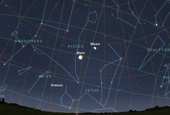 La Luna pasa 3° al sur de Marte al mediodía de éste jueves (Hora Local de Venezuela GMT-4). Para cuando la pareja se encuentren en el horizonte al atardecer, estarán separados por poco más de 4°. Los encontrará en el este, elevándose a medida que el cielo se oscurece, con Marte justo en la esquina inferior izquierda de la Luna desde hoy 28 de octubre y luego en la parte superior derecha el día 29 de octubre. El Planeta Rojo, que sigue siendo un faro brillante dos semanas después de la oposición, se ilumina con una magnitud de -2,2 y parece de 20″de ancho.