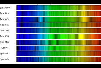 Selección de 10 espectros estelares mostrando las clases principales (O, B, A, F, G, K, M) y tres clases más exóticas: una estrella tipo C (de carbono, estrellas muy viejas), una estrella de tipo S (estrellas gigantes tardías) e incluso una estrella Wolf-Rayet (WR), en particular una Wolf-Rayet rica en carbono (WC), donde se distinguen claramente no sólo líneas oscuras sino un par de líneas de emisión en color azul (a unos 4650 Å) y otra muy evidente en color rojo (a unos 5800 Å). Cinco de las estrellas tienen nombre propio: Spica, Procyon, Mizar y Arturo incluidas. Estos espectros se obtuvieron con métodos de astrónomo aficionado. Crédito: Allan Hall.