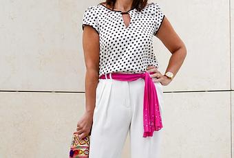 En este primer look el pantalón blanco lo he combinado con camisa blanca con lunares negros y he mezclado estampados y texturas al combinarlo con el bolso étnico y el toque de color con el rosa de los zapatos.