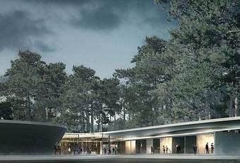 La nube sólo toca el suelo en la parte que se espesa para albergar el espacio de actuación, y se cierne entre los árboles, como la casa del árbol de una plataforma de observación, suspendida en el entorno natural del bosque.