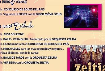 El sábado a las 12 misa solemne con posterior vermú amenizado por Orquesta Zeltia, por la tarde sigue el concurso de bolos y habrá hinchables para los pequeños, ya por la tarde a partir de las 19:30 horas baile de tarde con la Orquesta Zeltia y verbena a las 00 horas con la misma orquesta