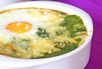 Ponemos las espinacas en cazuelitas individuales y cáscamos un huevo sobre cada una de ellas, también ponemos un poco de queso por encima y las metemos al horno para gratinarlas durante unos 10 minutos, el horno deberá estar precalentado a 200ºC. Una vez sacadas del horno las dejamos entibiar y ya podemos servirlas.