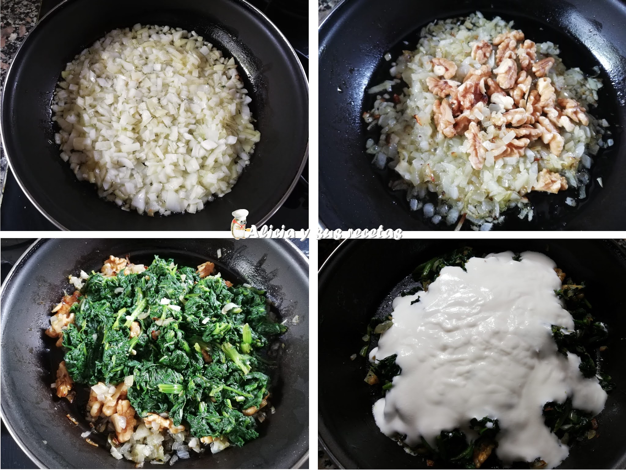 Después agrega las espinacas (si tuvieran mucha agua, estruja antes de echarlas para que queden más bien secas).