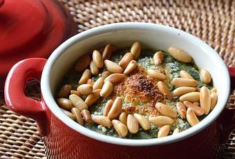 - Volcar el contenido del vaso en una fuente de horno. Espolvorear con el queso rallado y gratinar en el horno. Mientras saltear los piñones y repartirlos por encima.