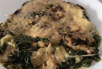 Precalentar el horno.A continuación, incorporar las espinacas a la cazuela, aumentar el fuego hasta que estén cocinadas y se hayan reducido. Sazonar.Añadir el queso crema y mezclar.Hacer una bechamel calentando la mantequilla en un cazo. Cuándo esté derretida añadir la harina y remover para que ésta se cocine. Ir añadiendo la leche templada hasta que espese.Sazonar y espolvorear nuez moscada recien rallada.La bechamel se incorpora alas espinacas, mezclando bien y dejando cocinar un par de minutos a fuego suave.Rallar el queso y espolvorear por encima de las espinacas.Introducir la fuente en el horno y gratinar.