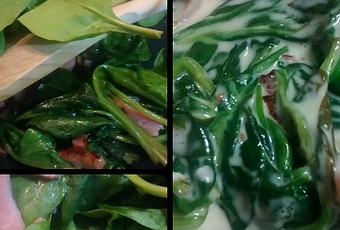-- Cuando se comience a dorar todo, añadimos las hojas de espinacas, usar una sartén grande porque al principio no caben bien.