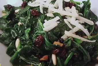 - En el wok, poner un chorrito de aceite y dorar un diente de ajo picado. Añadir un puñado de piñones y las pasas escurridas. Añadir las espinacas frescas y saltear todo junto. Al final, espolvorear con queso parmesano rallado (opcional) y servir.