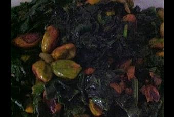 - Añade un puñado de pistachos pelados y mezcla, no es necesario añadir sal, el pistacho es salado, saltea durante un par de minutos y sirve.