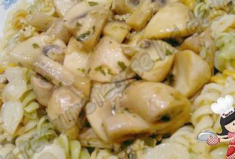 - Mientras se han estado cocinado los champis.....se habrá echado a hervir el agua, y habréis echado los espirales. Cuando estén listos, los echáis en la sartén con los champiñones. Remover y listo