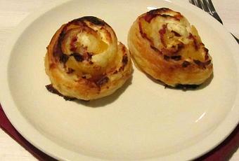 Elaboración En este caso he hecho dos versiones de espirales, una de ellas con jamón serrano y la otra con jamón cocido, llevando además, en ambos casos, tanto el queso de untar como la piña.Extendemos la masa de hojaldre y la untamos, con ayuda de un cuchillo, con el queso de untar. Sobre éste disponemos o bien el jamón serrano, o bien el jamón cocido.Escurrimos bien la piña en conserva y la troceamos. La repartimos por encima del jamón.Enrollamos la masa de hojaldre y procedemos a cortarlas en porciones de aproximadamente 1 cm.- 1,5 cm. de grosor.Ponemos papel de horno en la bandeja y colocamos sobre éste nuestras espirales ya rellenas, dejando un espacio entre ellas, puesto que aumentarán de volumen con el horneado.