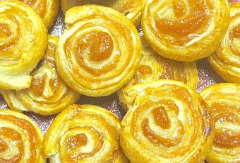 Extender la plancha de hojaldre y cubrir con una generosa capa de membrillo. Enrollar a lo largo, por la parte más larga hasta formar un cilindro apretando bien. Cortar rodajas de un dedo y medio aproximadamente, colocar sobre una placa de horno cubierta con papel de horno y pintar con huevo batido.
