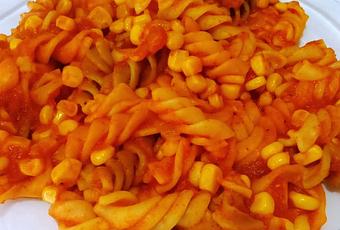 - 200 gramos de espirales de pasta. - Un sofrito de :1 trozo de pimiento rojo - 2 tomates medianos o 1 grande - 1 cebolla - 3 o 4 ajos - - Aceite de oliva. - 1 bote de maíz - sal. - Queso rallado ( Opcional )