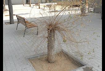 Poco después el Ayuntamiento de Barcelona, lo quitó porque parece que molestaba mucho, o porque se dieron cuenta de que la habían cagado, y dejó una placa en el suelo avisando que se volvería a poner en la próxima campaña de plantación.