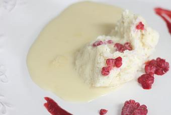 Sólo tienes que añadir la salsa de tres leches, el coulis de frambuesa y las frambuesas que has congelado a las que darás un pequeño golpe para que se deshagan.