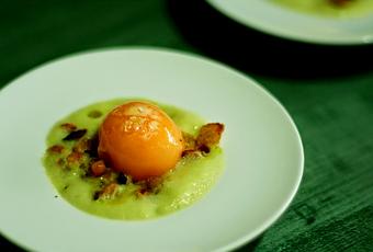¿A que me refiero con un crio huevo? Es un huevo cocinado en frío, metemos los huevos en el congelador, dentro de un taper, durante cuatro días, de esta forma conseguimos que se hagan bien. Una vez pasados los cuatro días los sacamos y dejamos unas horas descongelando dentro de la nevera. Cuando los vayamos a usar quitamos la clara, que en este caso tenemos que desechar. Nos quedaremos con la yema, una yema que se habrá quedado con una textura de pomada, untable. Antes de ponerlas en el plato las pondremos cerca de un foco de calor para que no estén demasiado frías. Probad a hacer los huevos así, acompañando lo que queráis, la textura es fabulosa. Para hacer la espuma de espárrago: Hacemos un puré, para ello quitamos la parte más dura del espárrago verde, los cortamos en dos (también los espárragos blancos) y los ponemos en una olla , junto con la patata pelada y cortada en trozos. Rehogamos con fuego fuerte y un poco de aceite, cuando cojan algo de color cubrimos de agua, añadimos sal y cocemos 20 minutos. Batimos todos los ingredientes que hemos cocido, quitar agua si fuese necesario para que no quede textura de sopa.Pasamos por un pasa purés para que no queden hebras. Medimos 350ml de este puré de espárragos y lo mezclamos con la nata. Colamos y metemos en el sifón que cargaremos con dos cargas, agitamos bien y reservamos. En el momento de emplatar calentar el sifón al baño María para que la crema esté tibia. Para hacer las migas: La vamos a dar un toque crujiente al plato, haremos unas migas suaves de sabor. Le quitamos al pan la corteza y picamos la miga, la remojamos con un poco de agua. En una sartén caliente con un poco de aceite metemos el diente de ajo al que antes le daremos un golpe para que se abra. En esta misma sartén metemos la miga del pan y, a fuego medio, vamos haciéndolas, removiendo todo el rato para que no se quemen y queden crujientes y sueltas.