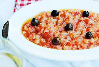 Rallar los tomates, mezclarlos con el bacalao escurrido, añadir los ajos picados menudos, un generoso chorro de aceite, pimienta negra molida y aceitunas negras.