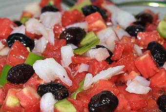 150 gramos de bacalao saladoUn tomate grande 300 gramos Un pimiento verdeMedia cebollaAceitunas negras (tipo Aragón)Aceite de oliva virgen extraSal Preparación