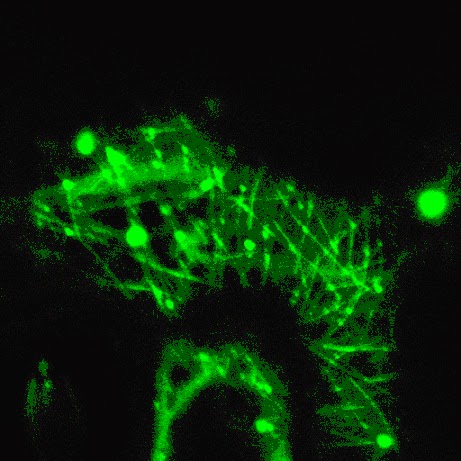 Localización de la proteína 2OG. Los filamentos que se observan en la figura 2 es donde se localiza 2OG. La construcción utilizada es GFP:2OG (GFP es una proteína fluorescente de color verde, que es utilizada como marcador molecular).