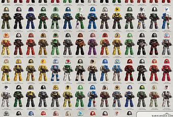 Antes de seguir adelante, os dejo esto, que me paso una seguidora del blog (Gracias, Anna). Creo que esta sacado de la White Dwarf. Son los esquemas de capítulos de Astartes leales al Imperio, portados por Primaris. Hay tanto capítulos "de siempre" como nuevos capítulos enteros de Primaris.