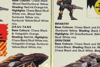 Vamos a empezar el día con esta imagen.Esta sacada de una de las viejas cajas de Epic40K ,1ª edición creo y muestra cuatro esquemas de color de ejemplo de cuatro ejércitos de Eldar.No son mundos Astronave,sino creo que representan a grupos de Corsarios,pero no estoy seguro.Vienen a mostrar esquemas diferenciados para infantería y vehículos(Eso que veis es un Falcon.Ya he hablado de ese modelo en otras entradas.Llego a hacerse a escala 28 mm en una tirada muy limitada de Armorcast) y como pintarlos.Eran mini guías de pintura para mini-miniaturas:)Pero aun así completas en lo básico.Si pincháis en la imagen o la abrís en otra pestaña o ventana de vuestro navegador se puede ver la imagen al 100%.