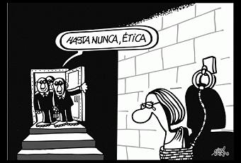 En fin, antes, cuando comía frente a la tele y las moscas de un cuerpo abierto en canal amenazaban con colarse en mi dieta cambiaba de programa. Ahora lo hago cuando un Rajoy enardece; cuando un Zapatero languidece ahogándose en su propia mentira; cuando una Aguirre no ofrece esperanzas a los que educan, vengándose de los que la reprendieron por no llevar hechos los deberes; cuando una ministra de defensa, otrora pacifista, estrecha manos y declara guerras de intenciones; cuando un Chávez no da un chavo por sus ciudadanos; cuando un comunista olvida que los pueblos necesitan realidades sociales y no utopías; cuando los verdes sólo defienden el color de los euros que tapizan valles; cuando los nacionalistas se dan de hostias por representar a su partido en Madrid alojándose en hoteles de plazas Españas de cinco estrellas y desayuno con diamantes de por vida; cuando un Gallardón guiña a los de centro izquierda con el ojo tuerto; cuando, en definitiva, unos anuncian recortes y otros subidas que alejen de nosotros la posibilidad de alcanzar un nivel de vida digno.