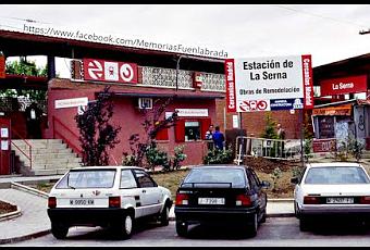 Imagen de los 90 donde observamos la Estación de la Serna-Fuenlabrada con su antiguo aspecto. Podemos ver una taquilla y un acceso directamente al andén sin tornos. El cartel de obra anuncia su remodelación, obras que terminaron en 1996.