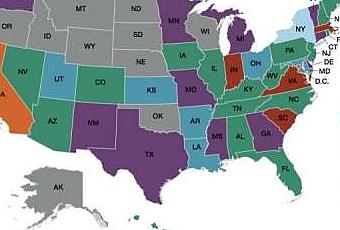 El presente mapa presenta el resultado de la evaluación realizada por el Instituto Fordham sobre estado de las ciencias en EEUU, representado por estados y calificado desde la A (máxima posible) a F (la peor posible).