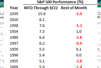 Aquí os pongo un análisis sobre los mejores Septiembres desde 1939 ,hasta día de hoy llevamos un 8,10% de rentabilidad ,siendo el mejor desde ese año ,aun lejos de la rentabilidad del 15,60% pero muy por encima de la media del 5% de los mejores Septiembres ,la media de bajada de estos meses a partir de aquí es un 1,20% . un saludo