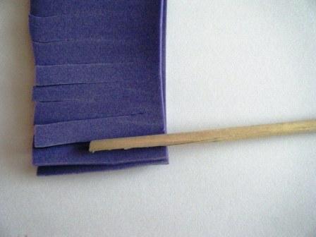 Flor con impresión de un pincel de fomiMateriales:- pedazo de fomi de cualquier color y con forma rectangular de 10 x 20 cm.- témperas - tijeras- pincel- silicona- palo delgado de maderaElaboración del pincel:1.- Doblar el fomi y recortar en flecos.