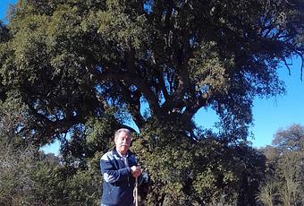 El alcornoque parece interminable, del grosor de su tronco nace otra corpulenta rama hacia la altura y de esta otra de no menos bulto… y así parece que quiere formar una escalera ascendente para recordarnos a los humanos la necesidad de aspirar siempre hacia lo alto, hacia la contemplación y la acción como los dos pilares de transformación de esta tierra en un lugar mejor para todas las personas y la naturaleza entera.