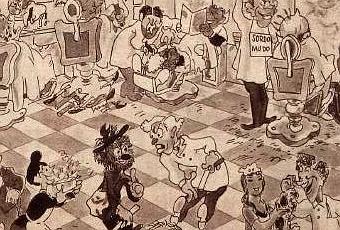 En nuestra anterior estampa de Madrid pueblo, el dibujante Bellón ofrecía su particular visión de un Salón de belleza que bien podía estar situado en la Gran Vía.La estampa de hoy es menos glamurosa y quizá más disparatada. Bellón nos muestra la vida de una peluquería madrileña los sábados, con sus variopintos peluqueros y respectivos barbados y melenudos. Techos altos y típicas lámparas esféricas que ofrecían una luz amarillenta y mortecina; tan mortecina como los insectos que yacían en su interior.Oficiales parlanchines; sordo mudos; de mala baba... y también de mala uva (vino peleón); venidos a menos y a más; aprendices desde siempre y soñadores de salones de París. Sus víctimas, sin descripción, todo lo dicen sus caras.Gatos que rebañan entre pelos buscando orejas y otros restos faciales que arrastra la navaja. Desdichados de la vida que se acomodan para leer las revistas y periódicos atrasados que siempre se han ofrecido en salones de tal categoría; de paso, un poco de calor humano, que en mayo a veces hace frío.El típico niño que se revoluciona ante la tijera, acaba encadenado. Por allí uno que corre con la cabeza en llamas buscando una boca de incendios. Y el peluquero más afortunado atiende a una joven despistada.
