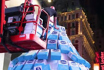 La transitada zona neoyorquina fue interrumpida por un cúmulo de más de 20 mil kilos de azúcar en cajas, que es la cantidad consumida por los más pequeños cada 5 minutos en Estados Unidos (sí, 5 minutos). Además, la pila estaba rodeada de niños esculpidos en azúcar que llevaban mensajes como "Tengo 9 años y peso 29 kilos. Cada año consumo mi propio peso en azúcares añadidos". La marca ha dejado claro que no están en contra del azúcar, sino que "no defienden los productos percibidos como saludables y que están hechos principalmente de azúcar".