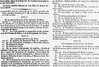 El Estatuto Real fue promulgado el 10 de abril de 1834 por la regente María Cristina de Borbón a modo de carta otorgada, similar a la que rigió en Francia con Luis XVIII, por la que se creaban unas nuevas Cortes entre las antiguas Cortes y las modernas, ya que estaban integradas por un Estamento de Próceres (Cámara Alta, a semejanza de la Cámara de los Lores británica), cuyos miembros no eran elegidos, puesto que, eran designados por la Corona entre la nobleza y los poseedores de grandes fortunas; y un Estamento de Procuradores (Cámara Baja, a imitación de la Cámara de los Comunes británica), cuyos miembros eran elegidos mediante un sufragio restringido.