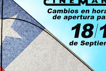 Durante la celebración, en Chile, de las Fiestas Patrias, las salas de cines de Cinemark Chile tendrán el siguiente horario de apertura: