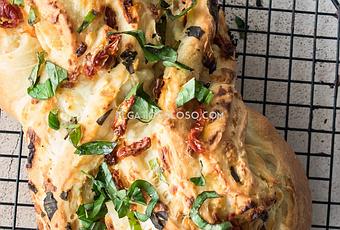 Este pan está elaborado con tomates secos (hechos en casa), ajo, queso y mucha albahaca. El resultado es un pan aromático y delicioso que recuerda a las pizzas con una forma realmente atractiva por el formado entorchado de la masa antes de llevarla al horno.