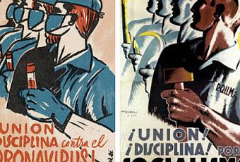 Carteles de Mr. Zé, basado en una gráfica de Carles Fontserè.“El enemigo no está a las puertas, penetró hace ya tiempo en la ciudad. Ahora, la muralla para contenerlo está en todo aquello que hemos puesto en pie como país y como comunidad”. No eran palabras de Manuel Azaña durante la Guerra Civil, sino del actual presidente, Pedro Sánchez, formulaba dos o tres días después de declarar estado de alarma por el brote de coronavirus. El lenguaje bélico de hace 75 años, tras unas despiadada Guerra Civil, volvía al discurso de los dirigentes del mundo para hablar de la lucha contra la pandemia. Y el director creativo vallisoletano, Félix Rodríguez, conocido como 'Mr. Zé', decidió rescatar la estética de los carteles de la II República y la Guerra Civil para concienciar al pueblo de la importancia de colaborar entre todos para erradicar dicho virus, a la manera de los artistas del bando republicano que durante la guerra sirvieron para –entre otras cosas– señalar la importancia de la higiene de los soldados a través de sus míticos carteles. De esta manera, el artista vallisoletano, aprovechaba la primera semana de reclusión durante el estado de alarma para diseñar la serie de carteles bajo el lema “Guerra al coronavirus” basados en diseños reales de la época. Y, través de sus diseños, quiso rememorar a reconocidos cartelistas de los años treinta que “crearon vanguardia a nivel mundial”, como José Bardasano, Carles Fontserè o Arturo Ballester, para crear sus propias proclamas en tiempos de coronavirus. “La idea era traerme los carteles de esa época al momento actual”, explica a Clara Roca en Eldiario.es. Con lemas actualizados como 'Unión y disciplina contra el coronavirus', Mr. Zé busca “que la gente se conciencie de que es algo que hay que ganar entre todos”.