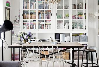 Si cuentas con luz, pero con espacios complejos, lo mejor es apostar por piezas ligeras. En este caso, la zona del comedor, realizada con una estructura de ruedas, y sillas variadas de aluminio, son el nexo de unión entre salón y cocina.