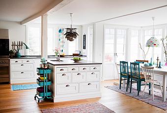 Para el comedor se han escogido sillas de diferentes estilos, incluyendo el color en algunas de ellas, mirad lo bien que queda el famoso carrito turquesa de Ikea en la cocina.