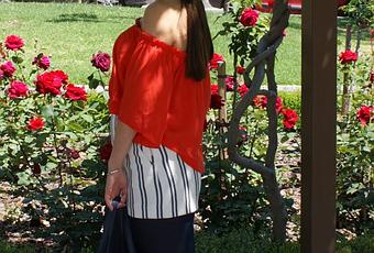 El look de hoy tiene dos tendencias, por un lado el top con los hombros descubiertos, y por otro los pantalones con rayas verticales. Para el top, el color rojo anaranjado, ya que es uno de los colores que más predominan y que es muy favorecedor. Para los pantalones un clásico, rayas blancas y azul marino, todo un acierto para este estampado. Para el calzado, unas manoletinas, muy cómodas y perfectas para un look de diario.