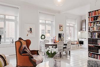 Los altos techos de este piso, sus molduras y rosetones se convierten en el enclave perfecto para introducir muebles de estilo. Las paredes pintadas de blanco y los suelos de madera también en blanco llenan de luz esta casa y son el lienzo perfecto para integrar muebles de estilo más clásico convirtiendo estas piezas en las perfectas protagonistas dentro de este estilo nórdico. Las paredes, decoradas con cuadros de línea abstracta y alguna ilustración dan una maestral pincelada de color.