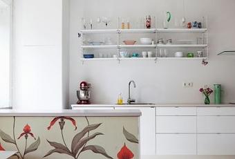¡Qué sencillo, pero que bonito y elegante! ¿no creéis? Este apartamento es casi perfecto, con un espacio semi-abierto para cocina – salón – comedor y un par de amplias habitaciones. Todo en blanco aprovechando bien la luz natural y detalles estratégicos de color, como la Kitchen Aid en rojo, jarra termo de Stelton en verde, las Sillas Hormiga de Fritz Hansen del comedor en verde también… hasta el color rosa de los balcones de los vecinos de enfrenten se integra bien en la decoración :) Personalmente no tendría el papel floral del frente del medio muro de la cocina al salón, pero es un sitio muy fácil de cambiar cuando uno lo desea. Por cierto estoy en Dinamarca en casa suegra unos días, por fin aire fresco :O